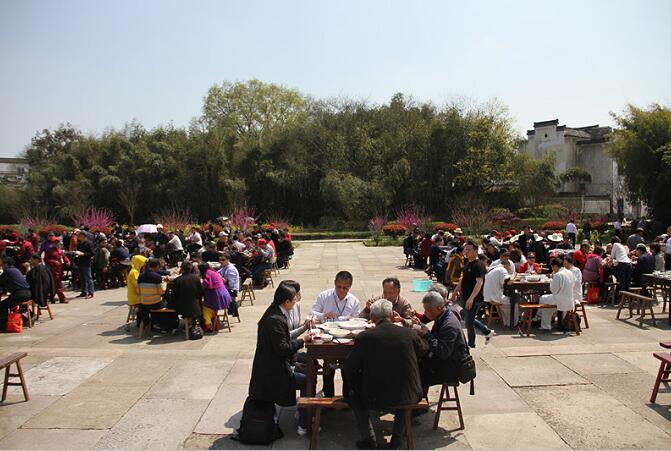 演出节目竣事后各地汪氏宗亲汇聚一堂,配合品尝徽州古板美食,七天井广场前摆上50桌“汪公宴”招待八方来客,规模盛大,似乎回到了古时“汪公大帝”的盛世时代。